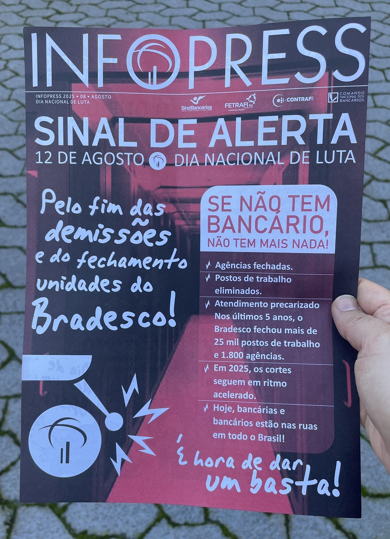 Na luta contra a redução dos empregos e o desmonte das agências, os bancários promoveram, nesta terça-feira (12/8), o Dia Nacional de Luta no Bradesco. Em todo o país, trabalhadores foram às ruas para denunciar a sobrecarga constante, o adoecimento crescente e a precarização do atendimento à população.