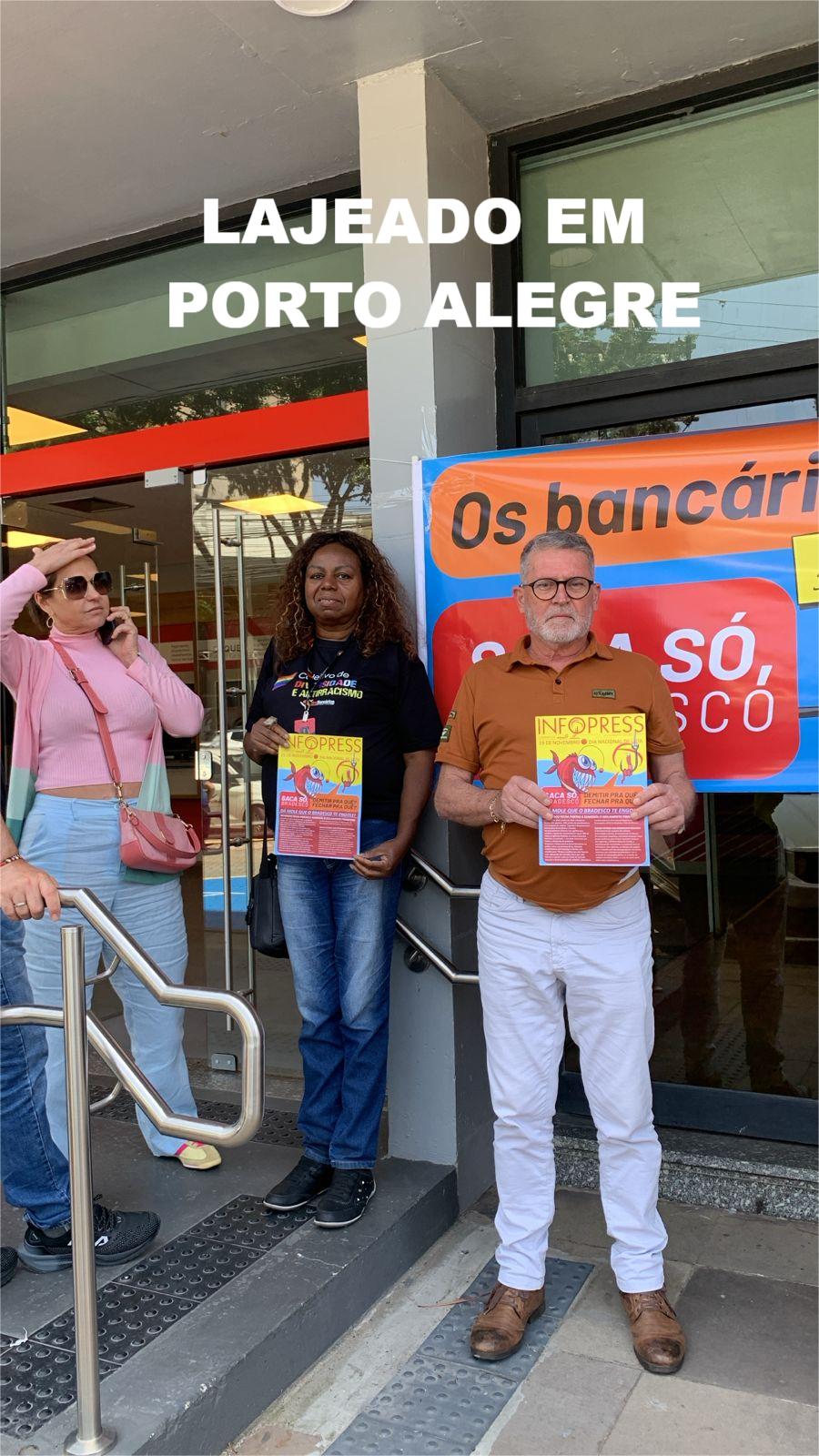 Mobilizações em todo o país denunciaram a política de fechamento de agências, a precarização do atendimento e os riscos impostos aos clientes ao serem empurrados para o correspondente bancário e o atendimento virtual.No Rio Grande do Sul, os protestos aconteceram na capital e em várias cidades do interior.