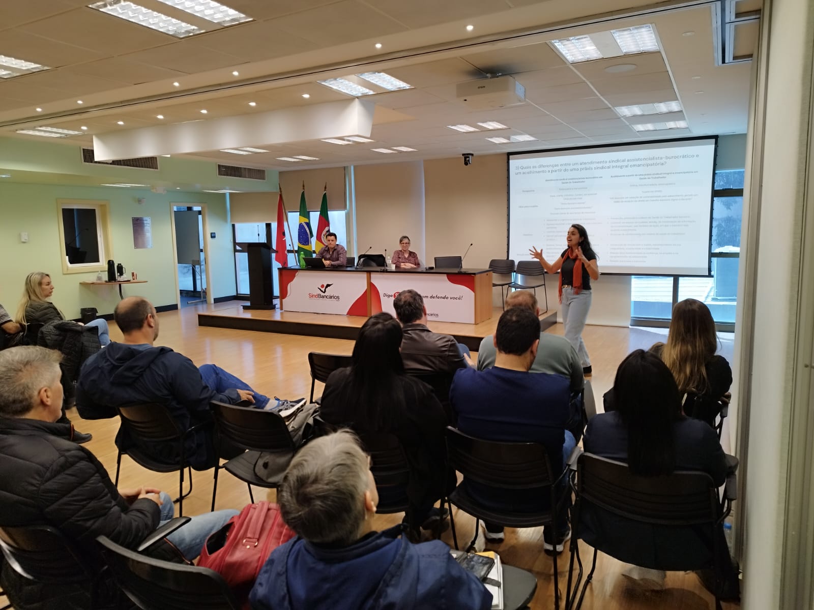 O encontro, que reuniu bancárias e bancários no auditório do Sindicato dos Bancários de Porto Alegre e Região, trouxe para o debate a burocracia que permeia as instituições quando o assunto é saúde. Manuela Fonseca, assistente social e professora na Universidade Nacional de Mar del Plata, Argentina, falou sobre o chamado acolhimento emancipatório, que vai além de uma abordagem técnica dos casos que envolvem o adoecimento no trabalho. "A ideia é transformar a fala individual em reflexão coletiva sobre direitos, saúde e condições de trabalho, através de uma escuta ativa, politizada e crítica, reconhecendo o trabalhador como sujeito coletivo e histórico", explicou.