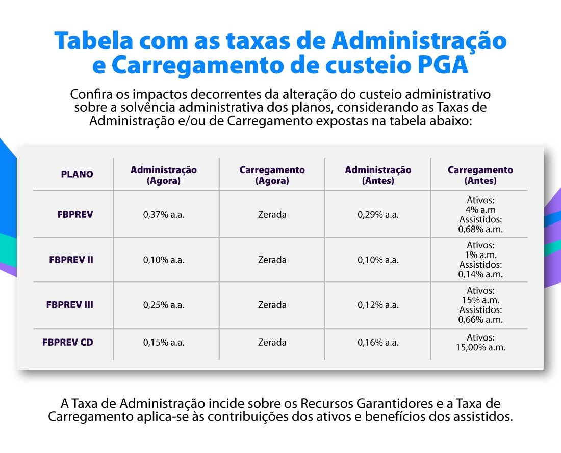 A principal mudança estabelecida é a redução das taxas de administração e a extinção total das taxas de carregamento para os planos FBPREV, FBPREV II, FBPREV III e FBPREVCD. De acordo com os representantes, a reestruturação foi fundamentada em rigorosos estudos atuariais e financeiros para garantir que o alívio nos custos não comprometesse a solidez institucional. "Conseguir reduzir essas taxas em menos de um ano de trabalho demonstra que é possível priorizar o bolso do participante mantendo a segurança técnica e a transparência", afirma Denise Corrêa. A conselheira ressaltou que a nova política de rateio foi o mecanismo que permitiu a viabilização das novas alíquotas.